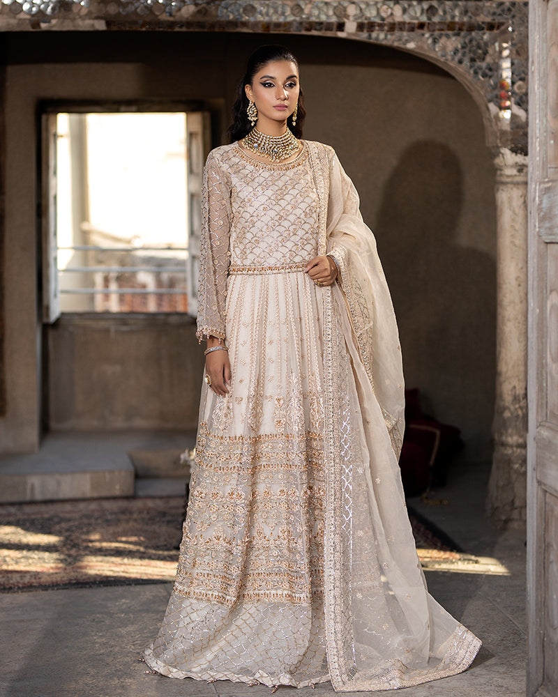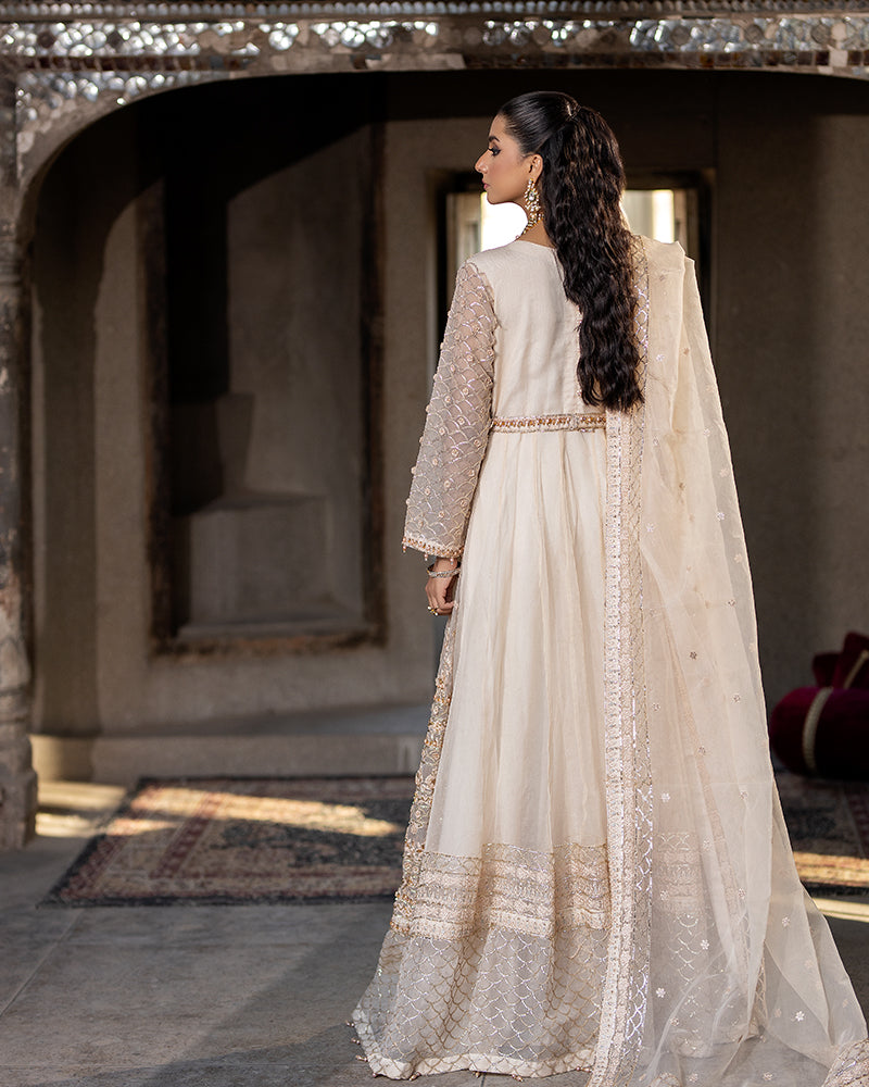 Organza Embroidered Maxi, enhanced with mesmerizing 3D embellishments, shimmering Sewroshki pearls, and delicate sequins