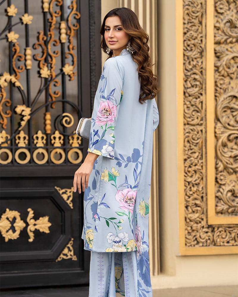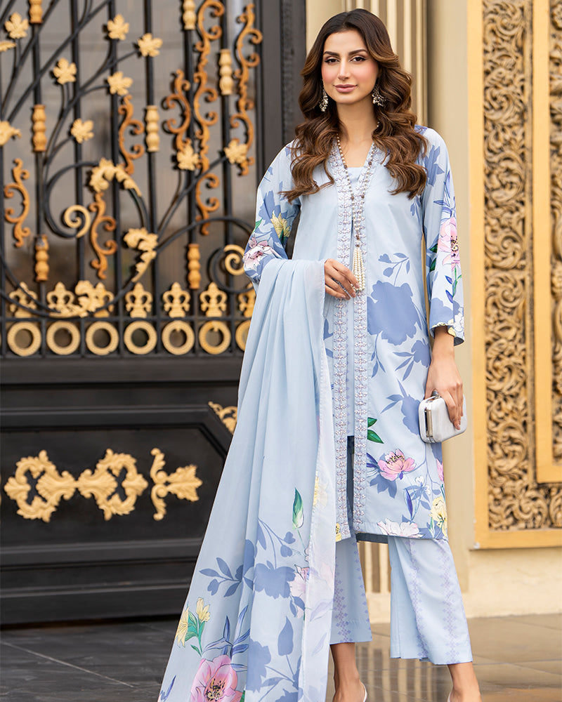 | Grip silk digital printed open gown that has been expertly crafted with intricate naqshi and stone work Separate grip silk digital printed inner Chiffon digital printed dupatta Grip silk digital print trouser |