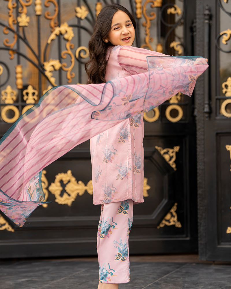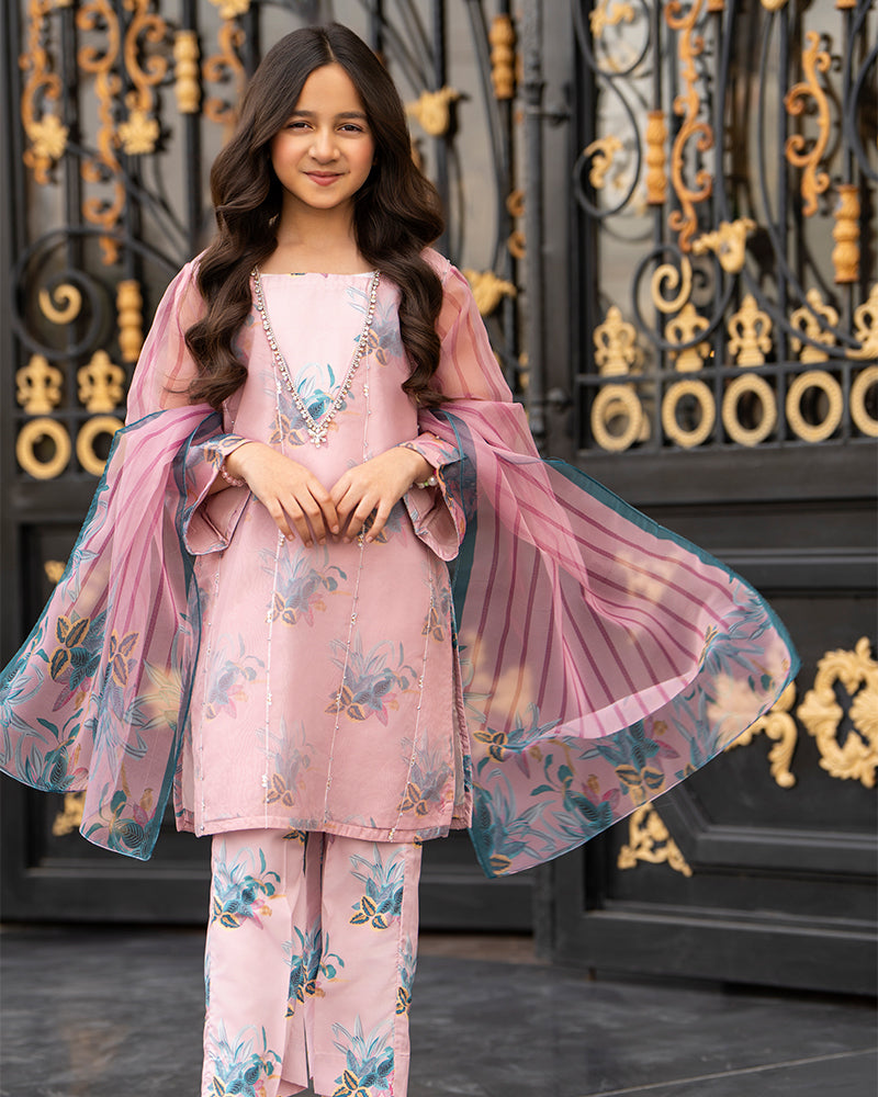 | Organza shirt, meticulously crafted with chainwork crystal and diamond spinel detailing, complete with a stunning grip silk digital printed lining Organza digital printed dupatta Grip silk digital print trouser |