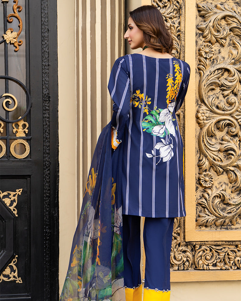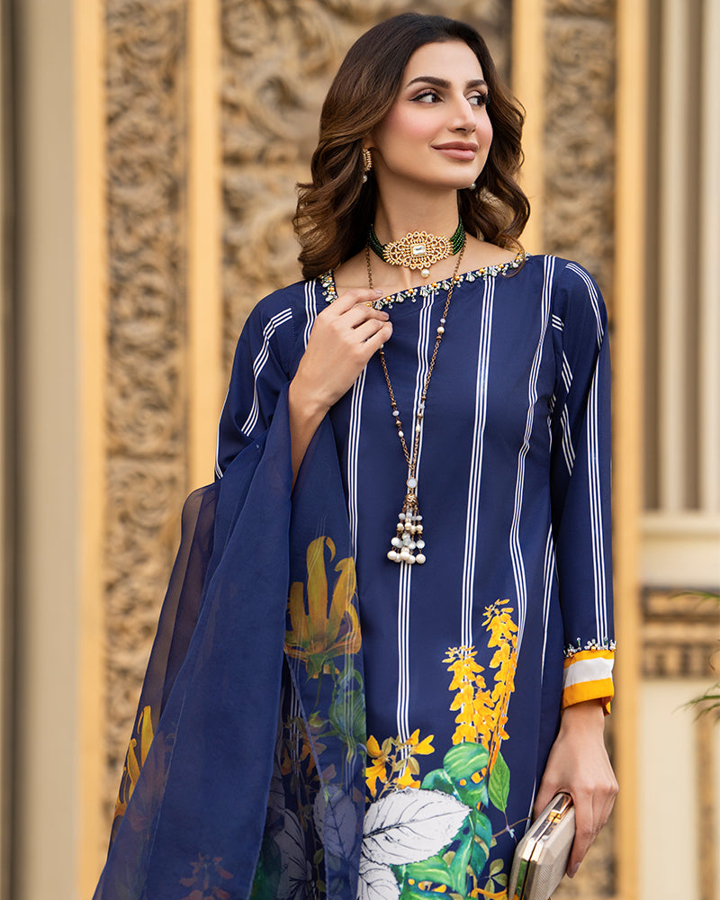 | Grip Silk Digital Printed Shirt, meticulously crafted with intricate crystal, pearl, and dabka work on the neckline and sleeves Stunning Organza Digital Printed Dupatta Grip Silk dyed Trouser crafted with pearls and crystal |