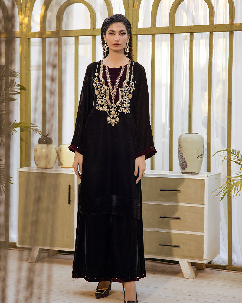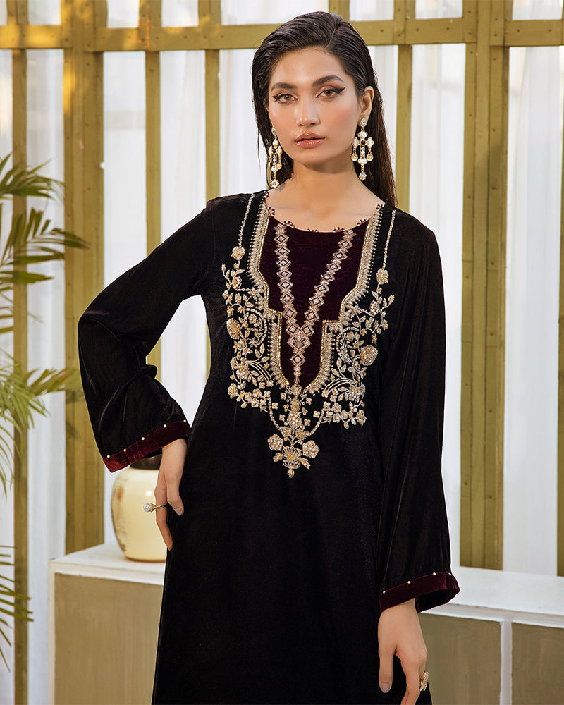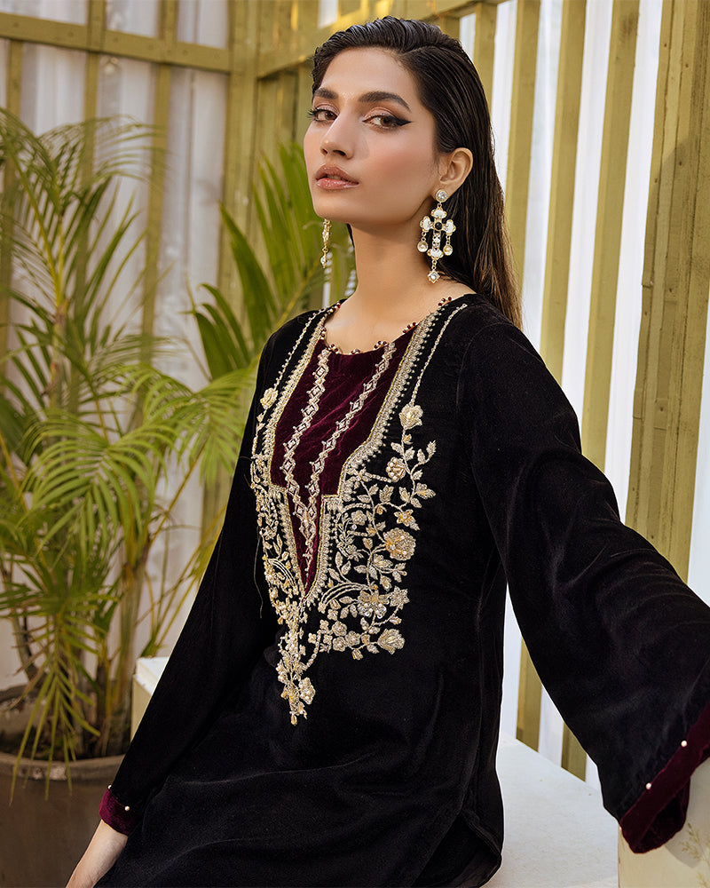 Professionally crafted (9,000 micro) velvet shirt adorned with exquisite embroidery and a delicate diamante spray