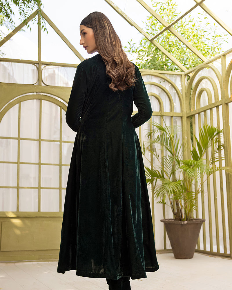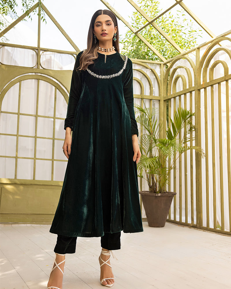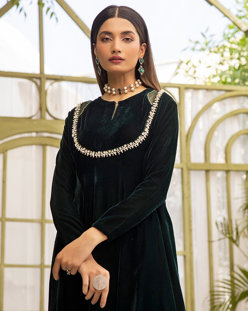 The stunning (9,000 micro) velvet hand embroidered long frock this ensemble exudes timeless charm and refined style