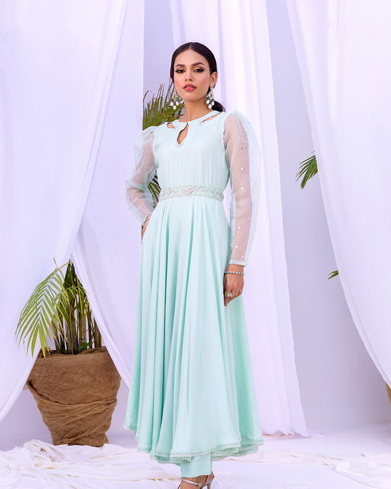 Introducing the stunning grip (crepe) long frock, now elevated with a beautifully handcrafted motif adorning the neckline. This exquisite piece is expertly stitched with delicate organza sleeves, adding an extra touch of elegance.
