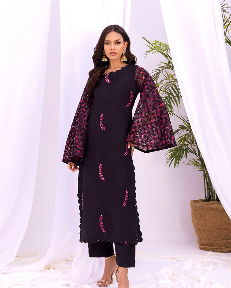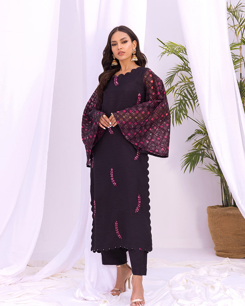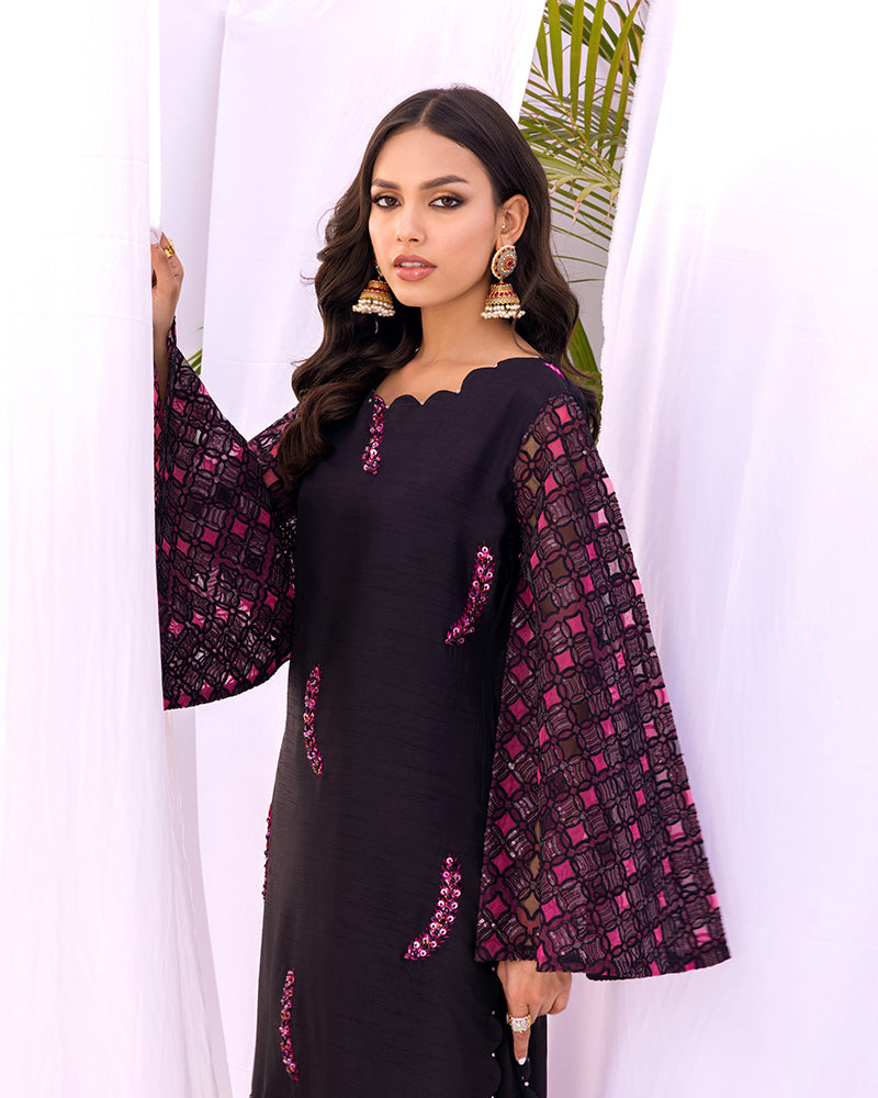 Introducing our exquisite Korean raw silk shirt, beautifully enhanced with intricate hand embellishments. This stunning piece boasts two-colored applic embroidered sleeves