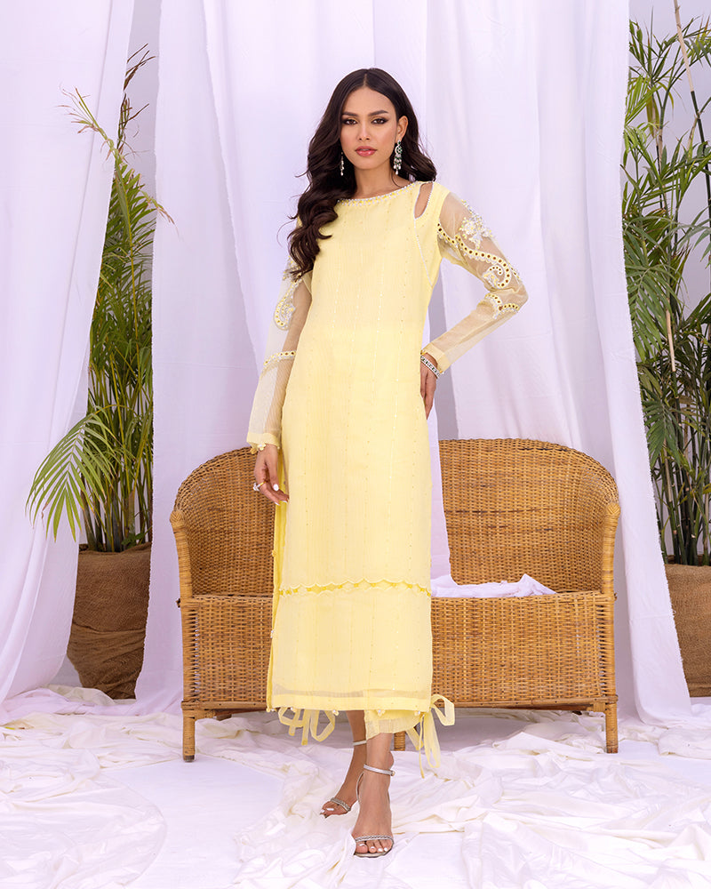Organza Khaadi Sequin Shirt, meticulously enhanced with hand-embellished details on the neckline and adorned with organza embroidery hand embellished sleeves.