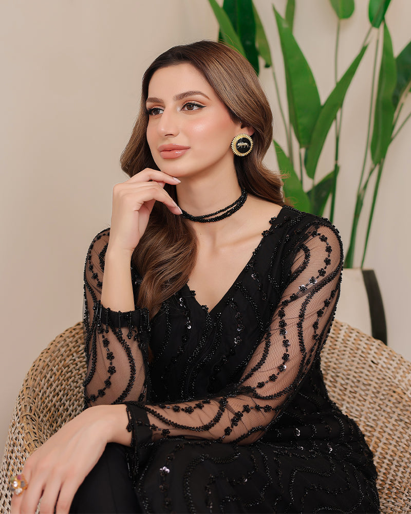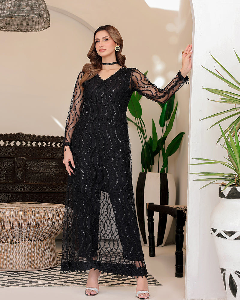 Introducing our stunning Net Sequin Front Open embroidered Gown! This exquisite gown features intricate cutdana detailing and pearl work.