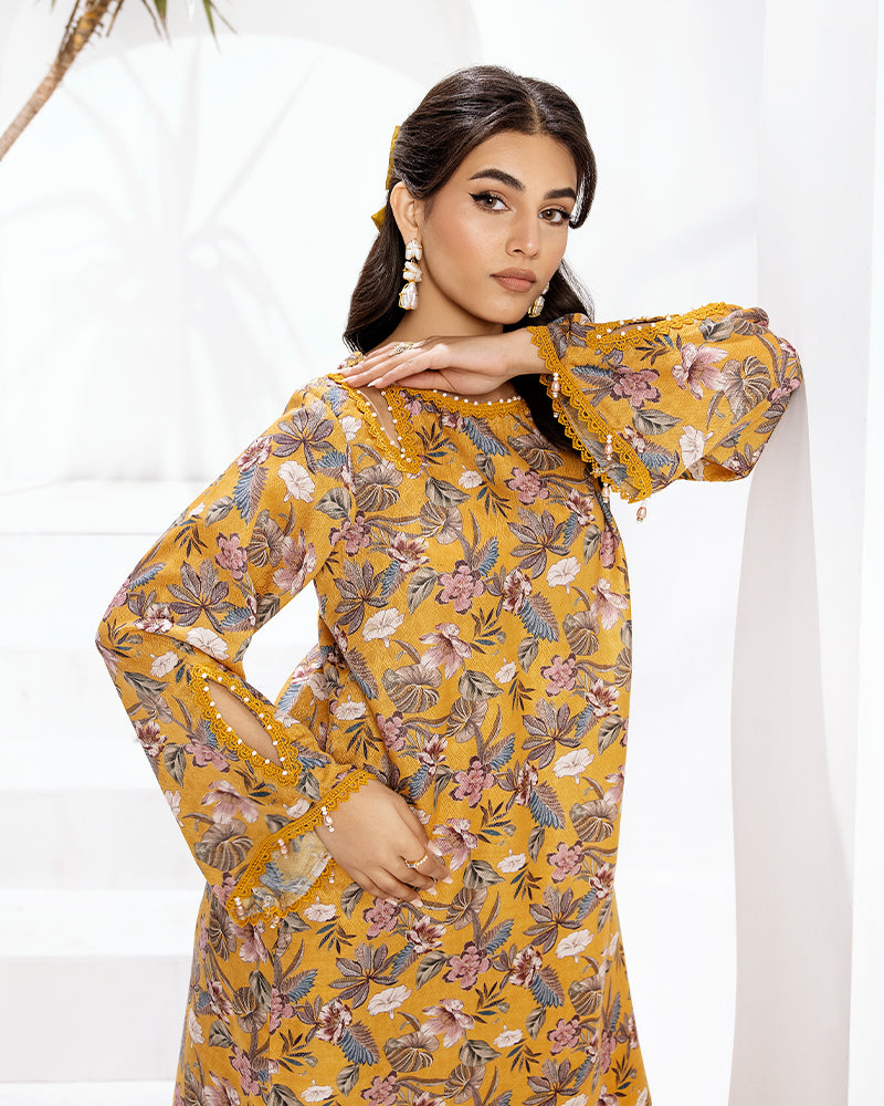 Introducing the exquisite masterpiece: a resplendent cotton self-jacquard printed shirt, adorned with opulent pearls and delicate lace embellishments gracing the neckline and sleeves.