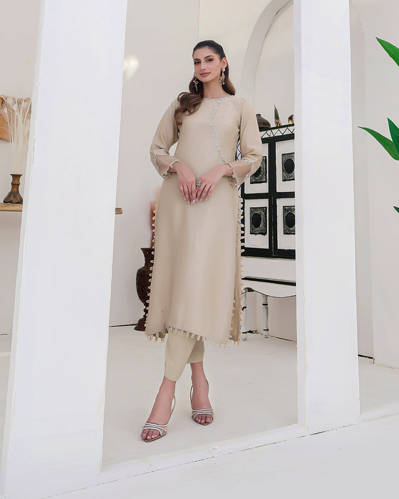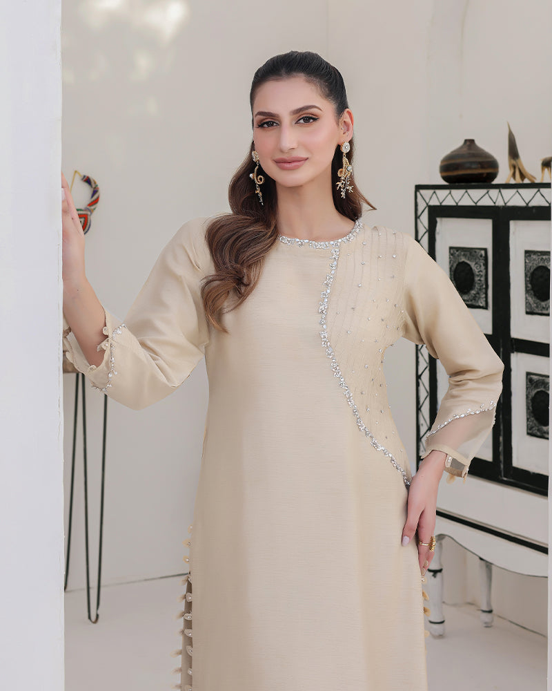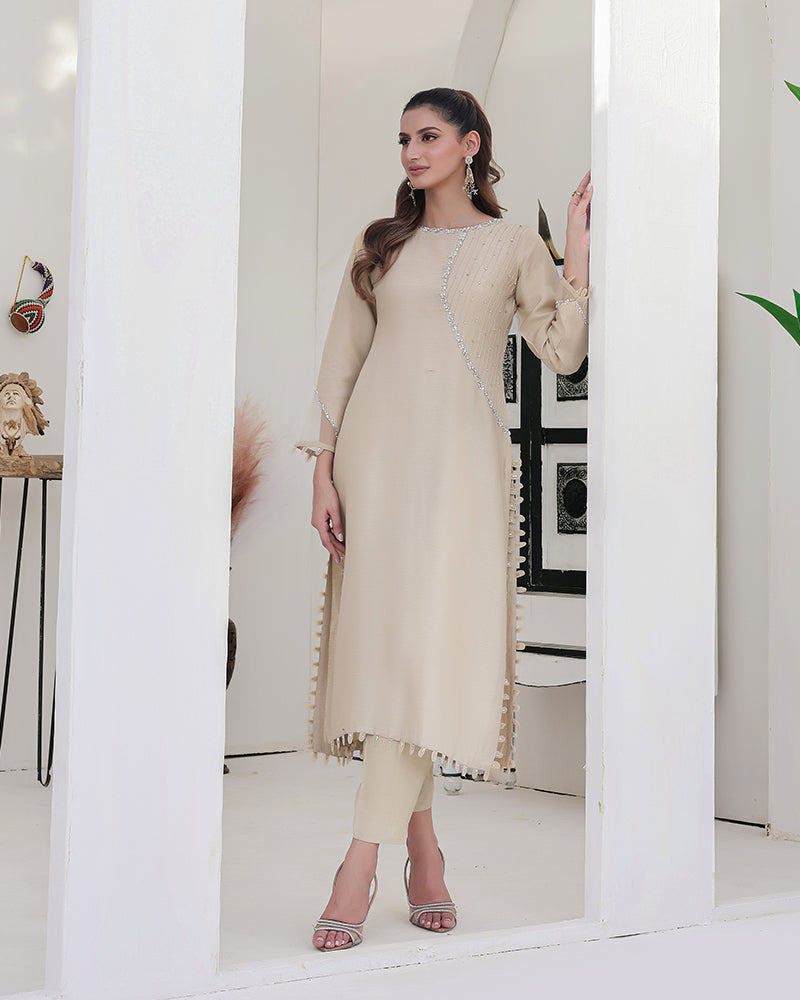 Stunning Korean raw silk shirt, featuring exquisite handcrafted embellishments on the neckline and bodice.