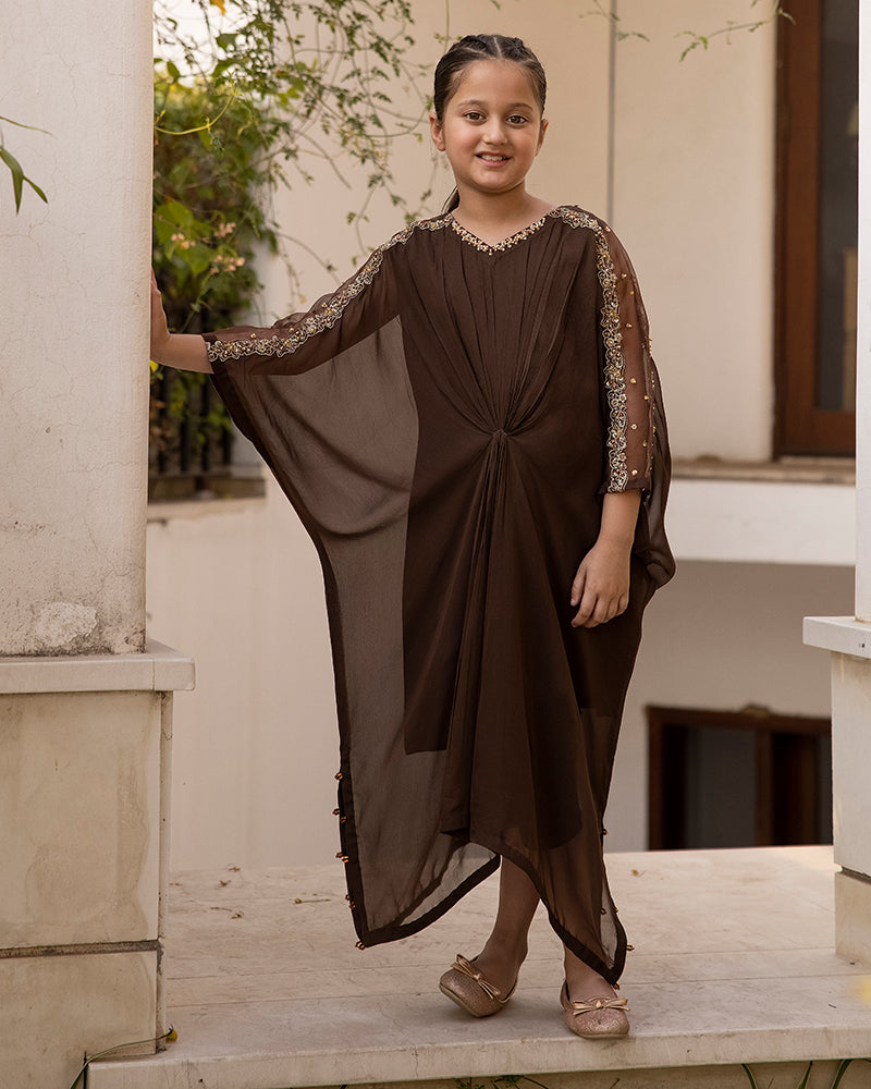 Chiffon embroidered poncho, adorned with intricate handcrafted adda work and stunning hand embellishments along the bottom. This garment exudes elegance and sophistication, making a bold statement with its unique design