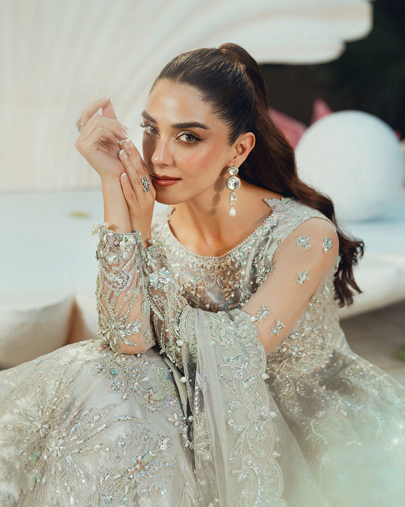 Additional Description: 1:CRYSTAL' is our contemporary classic Maxi Set crafted to perfection in grey net. It achieves a glistening dewy look with an exquisite composition of embroidery motifs adorned with intricate details of chain work, diamantes, sequins, pearls, crystals, dabka & naqshi work so you can radiate joy & confidence. 2-This organza dupatta dazzles with intricate adda work, adorned with shimmering sequins, lustrous pearls, and delightful sea shells that whisper tales of elegance 3- viscose trousers that provide both style and comfort