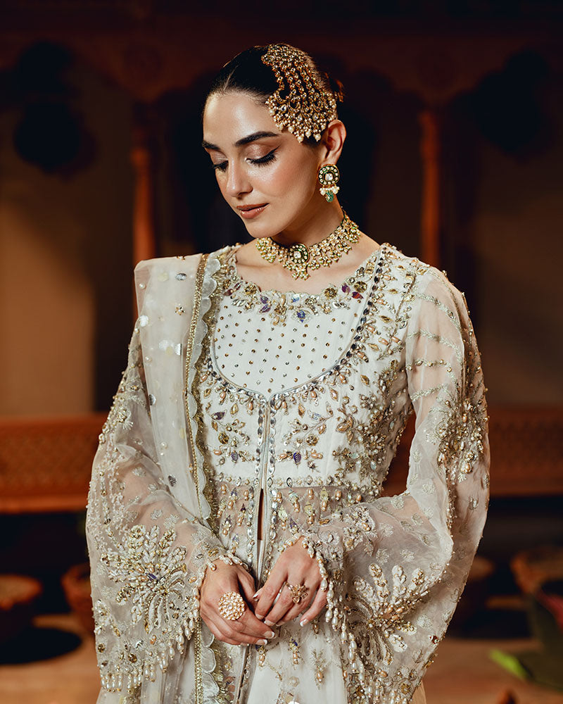 Additional Description: 1-Our signature 'uffrah' takes craft work on a new interpretation exquisitely designed organza peplum featuring intricate dabka chain work, delicate pearls, silver leaves, and gotta patti embellishments. 2-levate your ensemble with a stunning net dupatta featuring foil printing, embellished with pearls, sitara, and intricate Banarsi lace detailing. 3-Korean raw silk panel shararah, meticulously crafted with delicate pearls, silver leaves, sitara, and gotta patti embellishments. Elevate your style with this stunning piece.