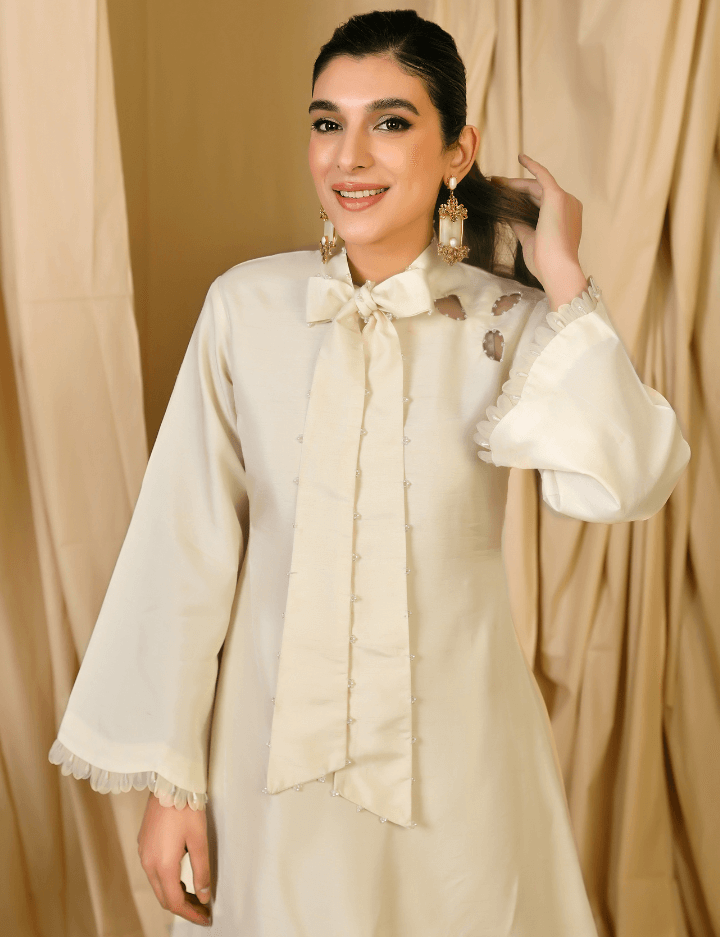 This two-piece stitched outfit is a perfect balance of sophistication and ease. The Korean raw silk shirt is simple and elegant, while the Korean raw silk embroidered bell bottom trousers feature intricate hand embellishments for a touch of opulence. The ensemble is versatile and suitable for any occasion, making it a must-have addition to your wardrobe.
