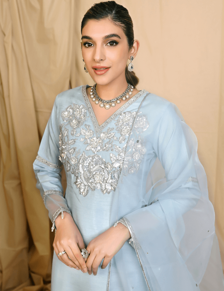 Make a luxurious statement with this three-piece stitched outfit. The korean raw silk embroidered shirt features intricate hand embellishments and a comfortable yet flattering fabric. The organza dupatta with diamante spray adds a touch of glamour, while the Korean raw silk trousers exude grace and style. This outfit is perfect for any formal occasion or special event, ensuring that you stand out with its timeless elegance.