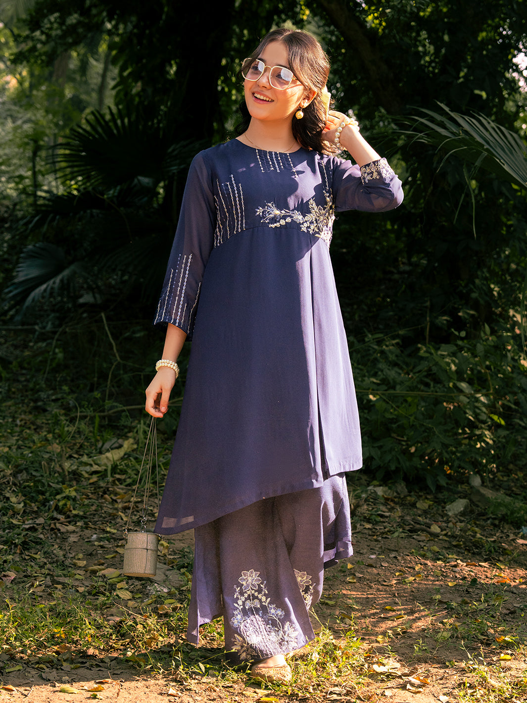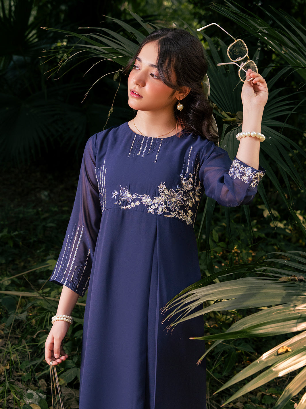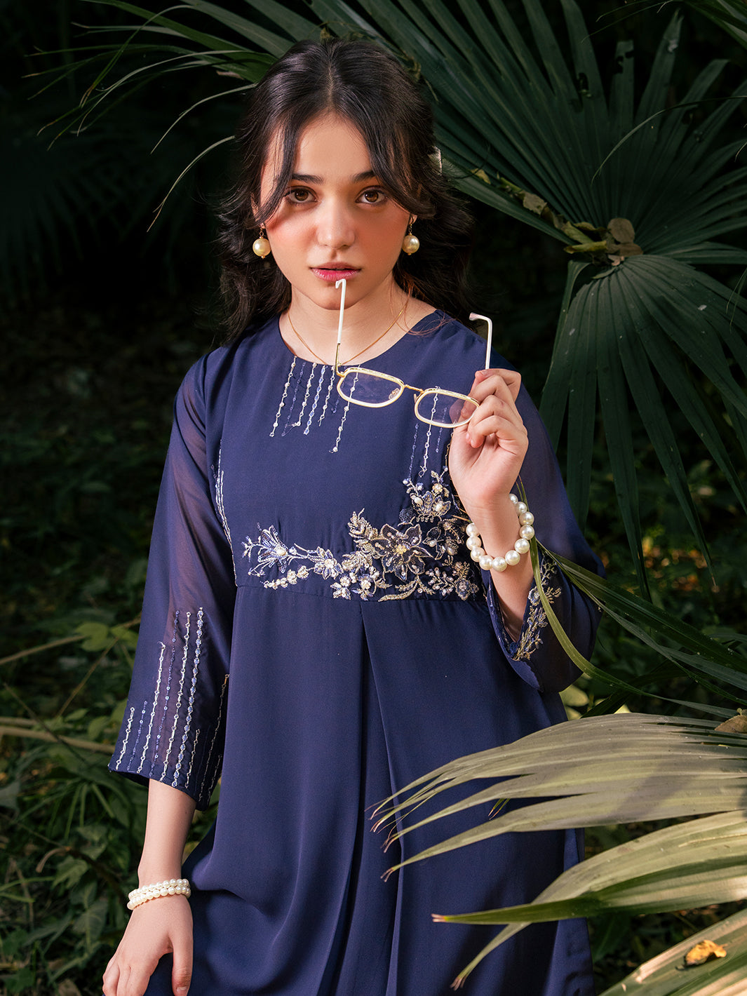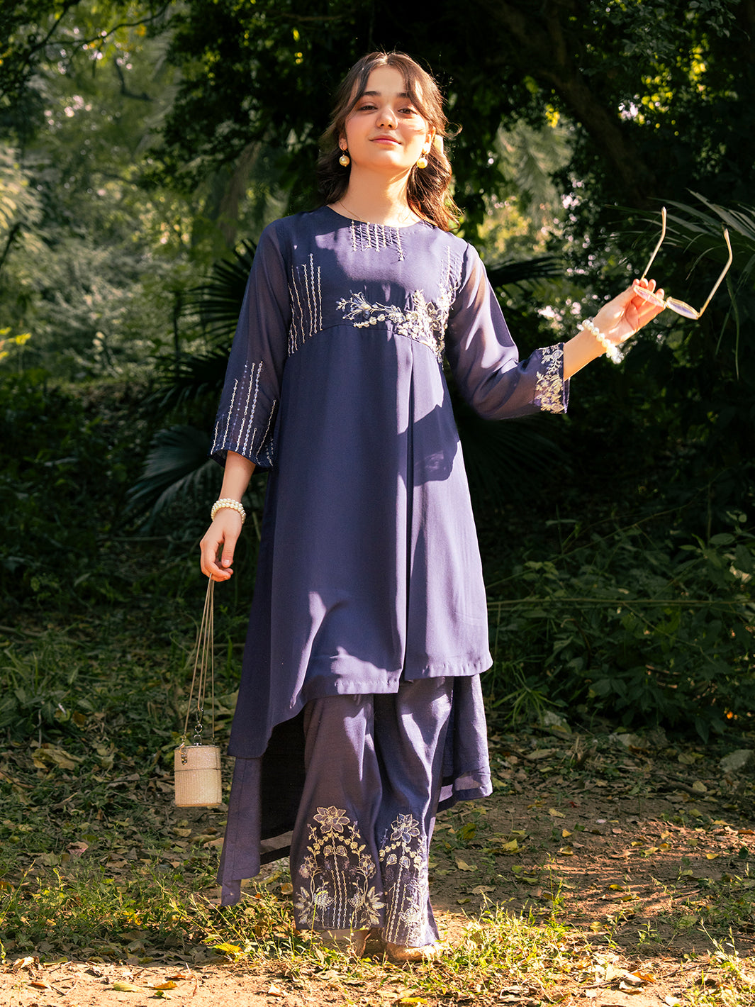 Chiffon back-tail shirt featuring exquisite sequin embroidery, meticulously handcrafted with adda work, naqshi, and dabka detailing.