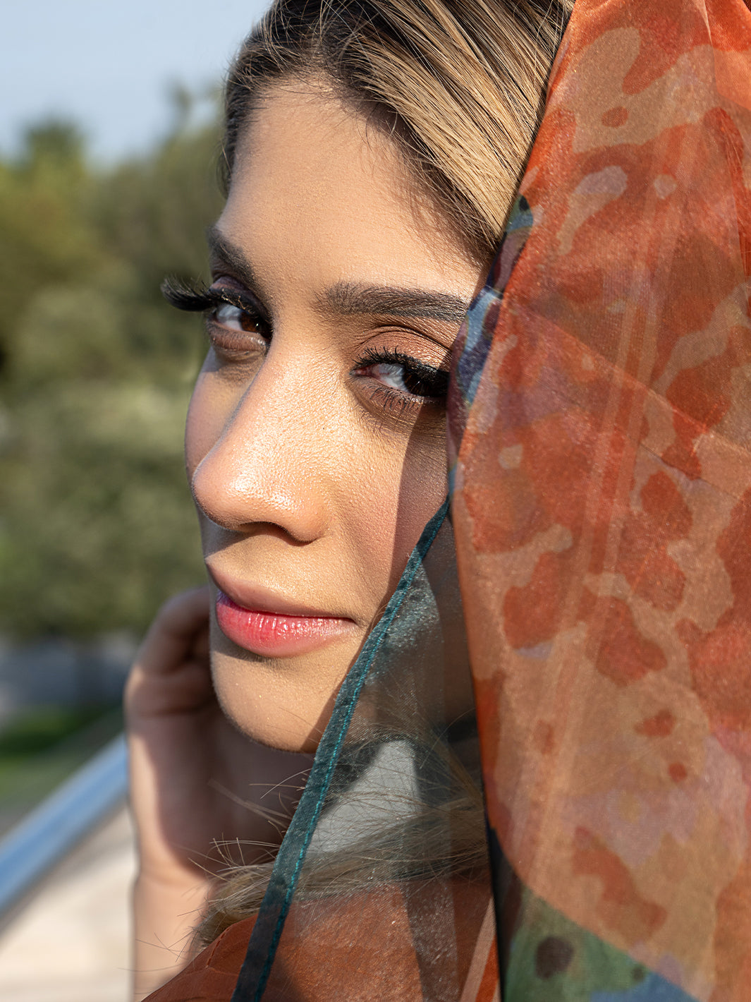 Digital print organza dupatta, a whisper of luxury that drapes with grace.