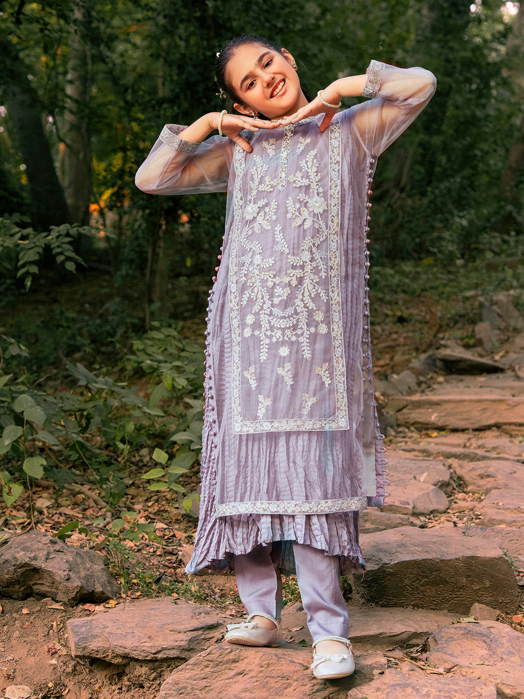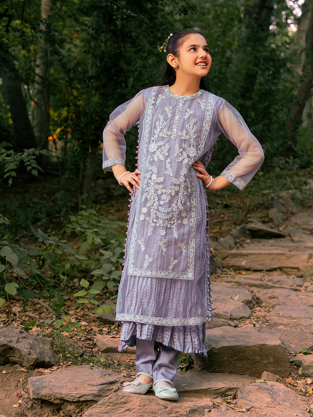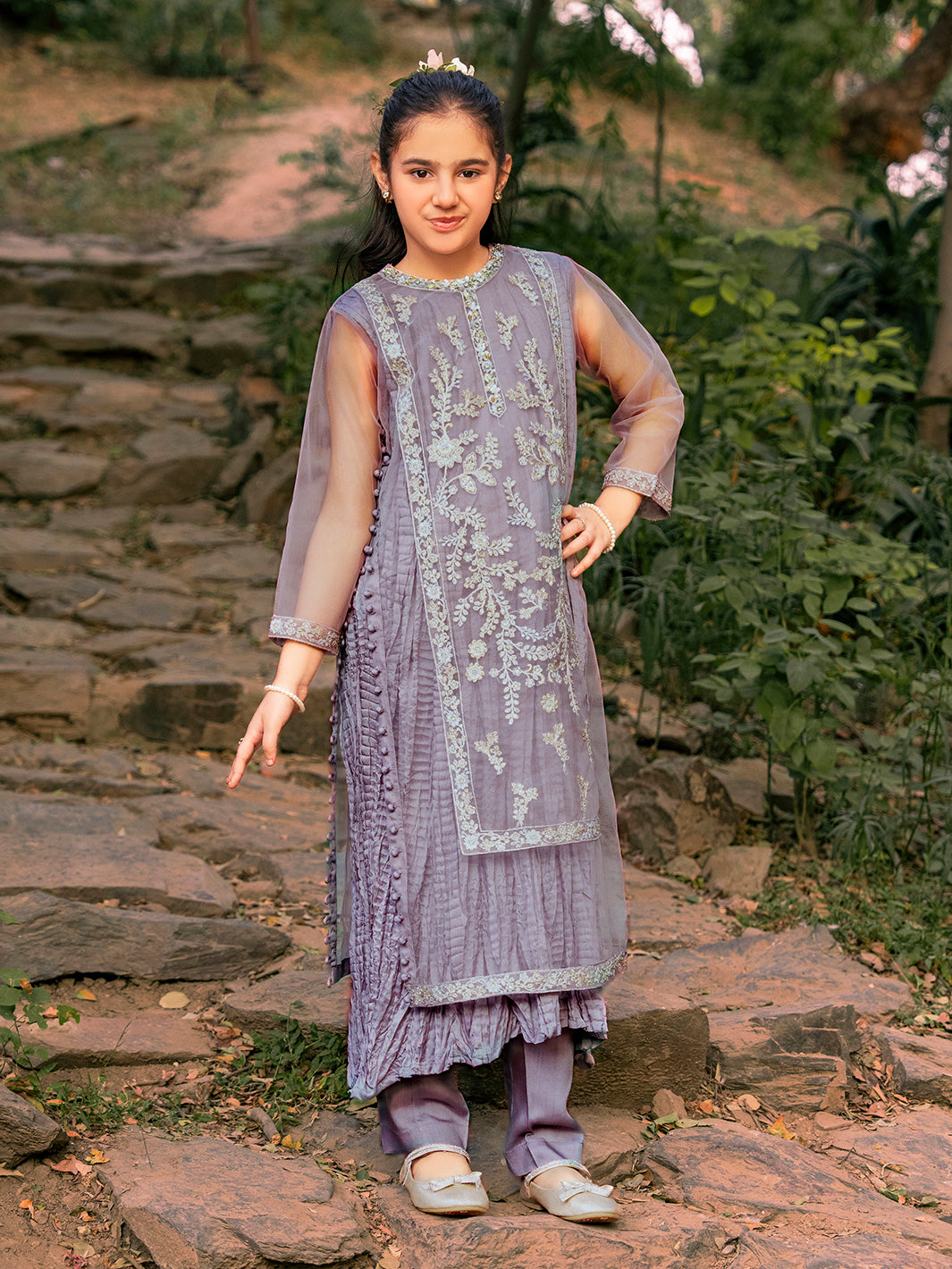 Net fabric shirt adorned with intricate sequin embroidery, complemented by hand-crafted adda work, pearls, stones, and naqshi detailing