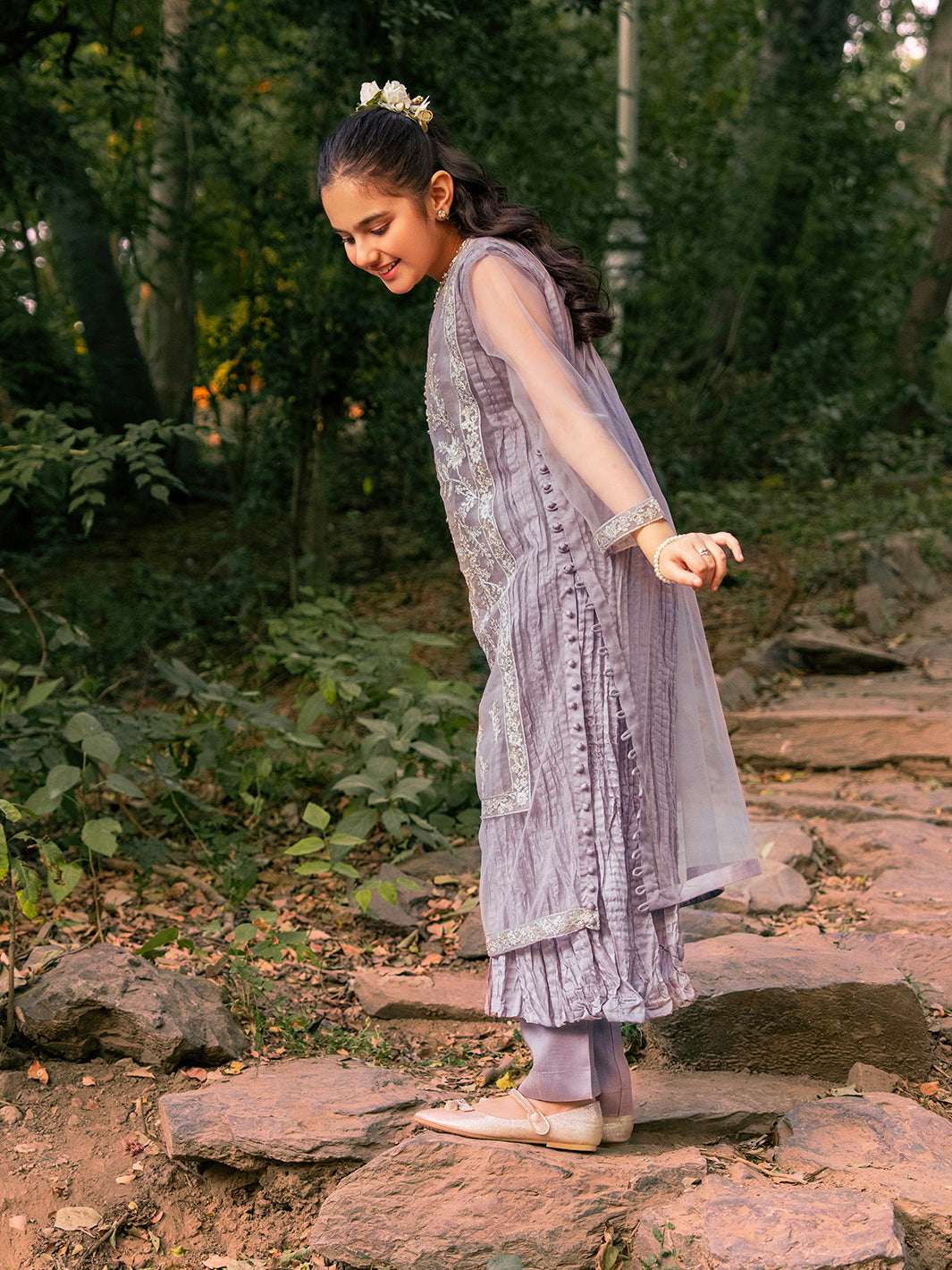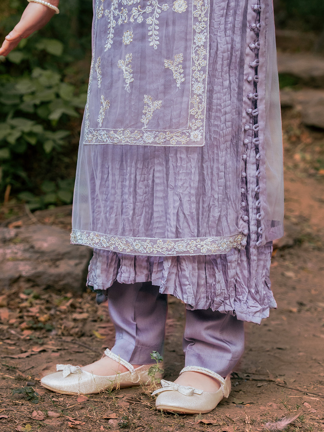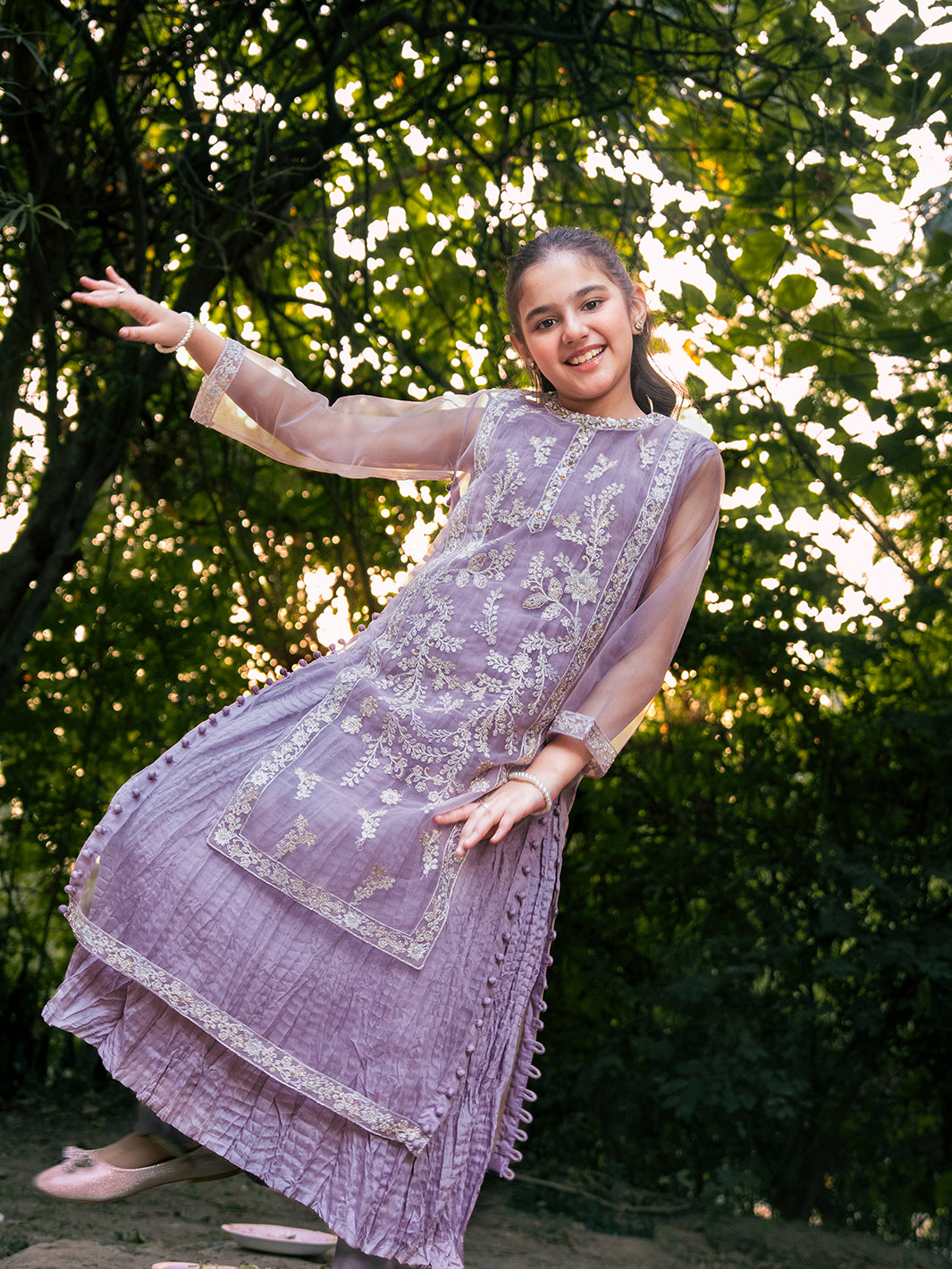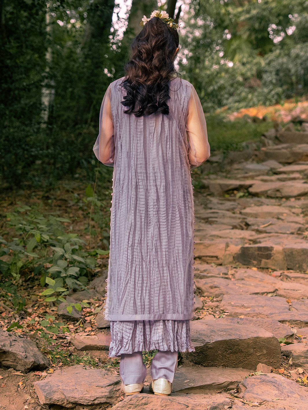 Net fabric shirt adorned with intricate sequin embroidery, complemented by hand-crafted adda work, pearls, stones, and naqshi detailing