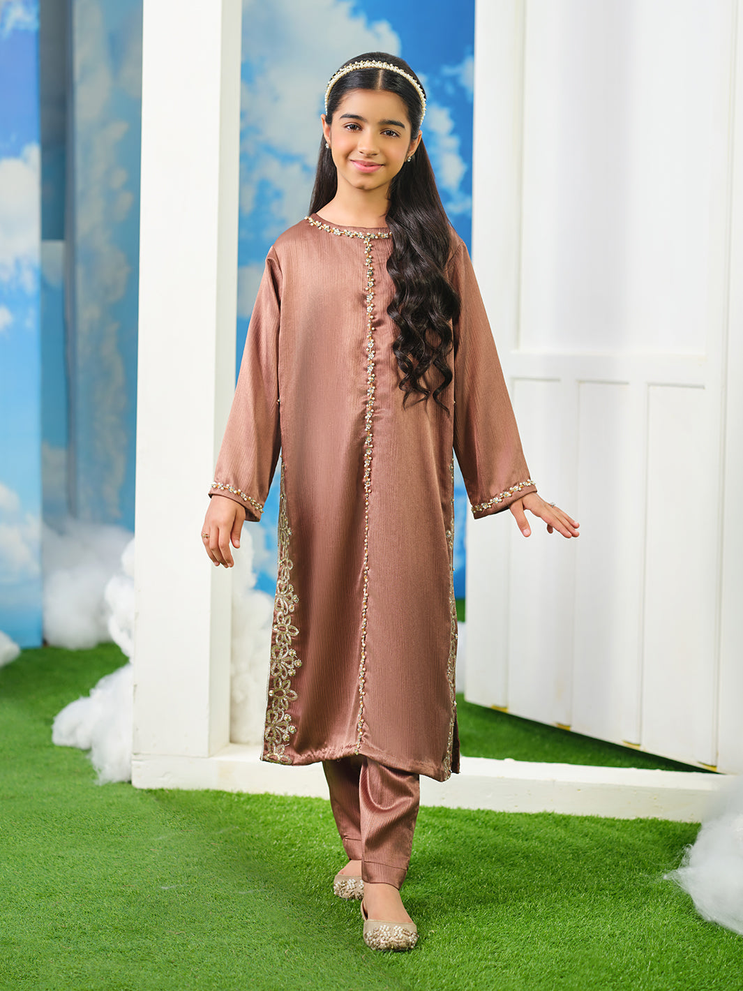 Crinkle silk shirt adorned with stunning spangle embroidery hand-composed adda work! This masterpiece is embellished with lustrous pearls, shimmering stones, and intricate dabka work,