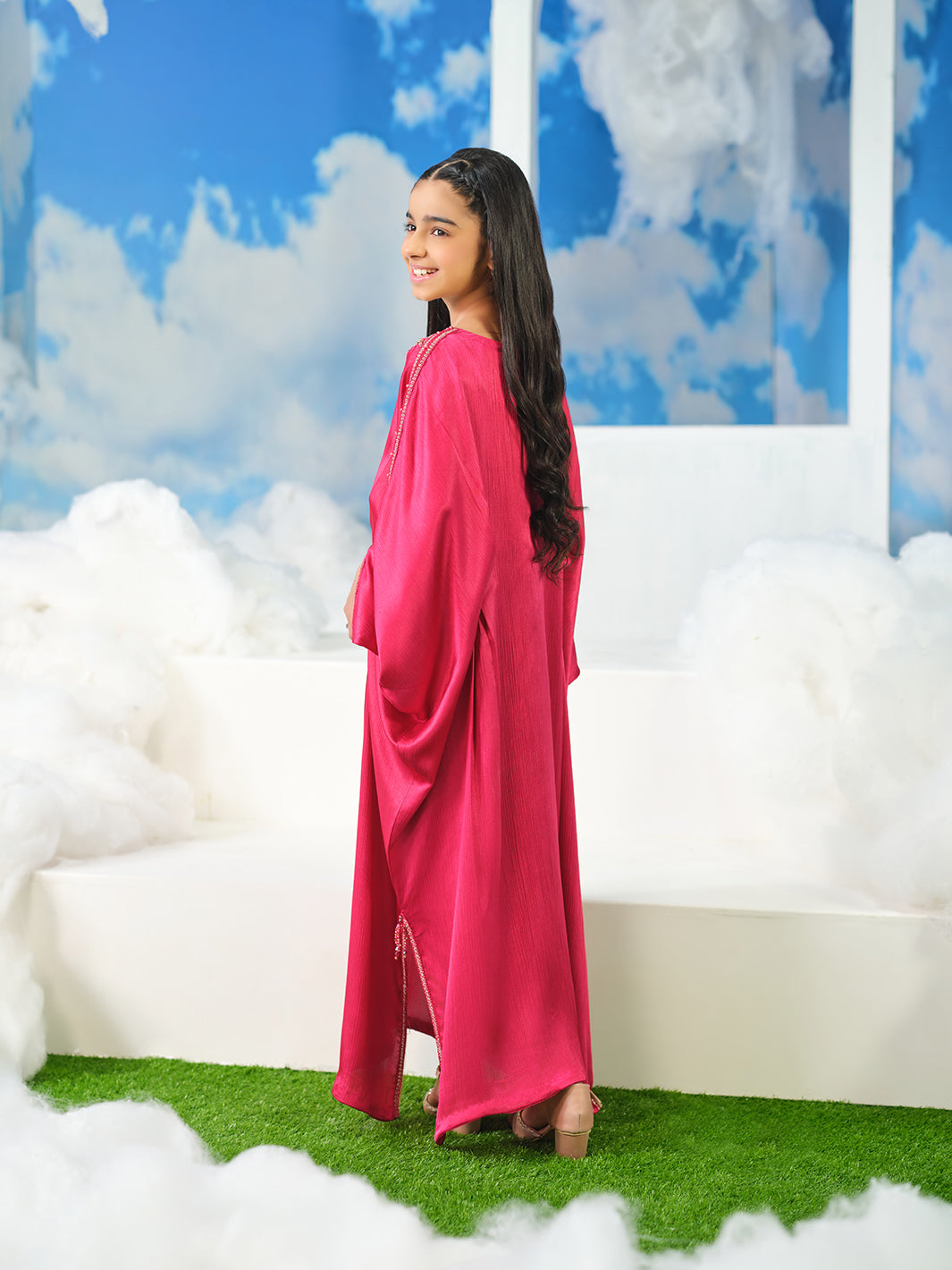 Crinkle silk cape, a masterpiece adorned with meticulously handcrafted adda work, where shimmering sequins dance alongside lustrous pearls, all intricately woven with the delicate artistry of naqshi work