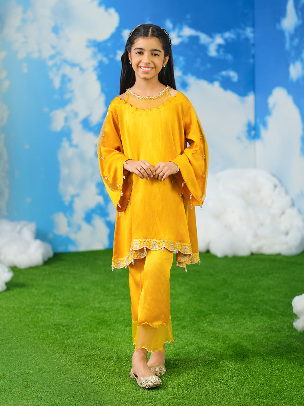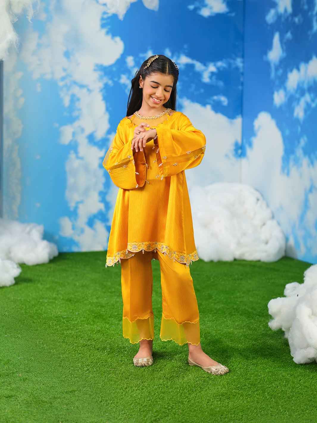 Crinkle silk shirt is expertly crafted with intricate sequin embroidery, featuring hand-composed adda work, complemented by stones, pearls, and crystals through detailed naqshi work.