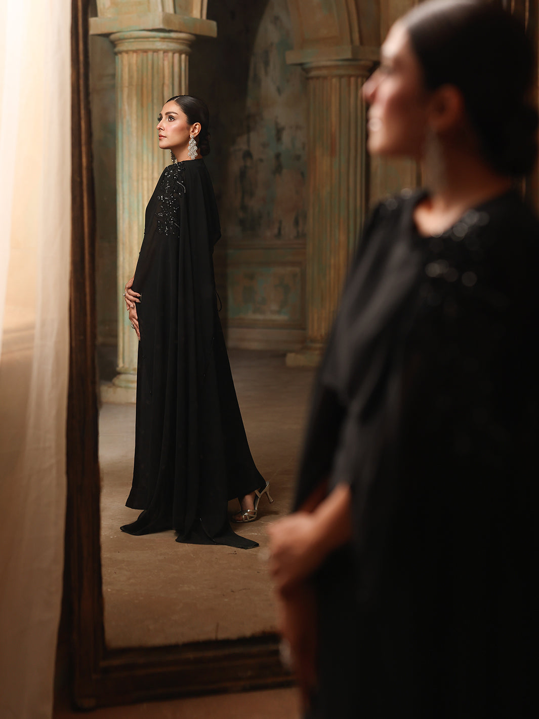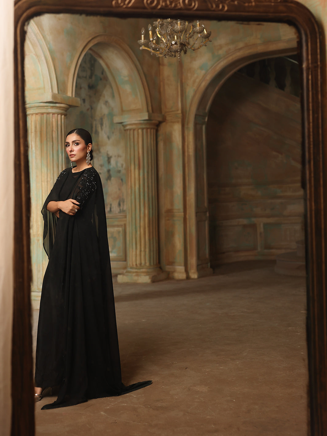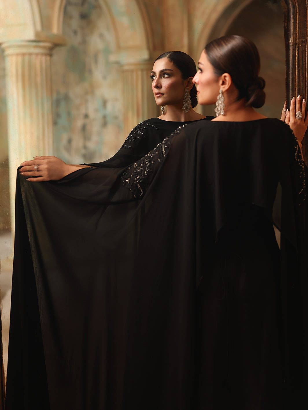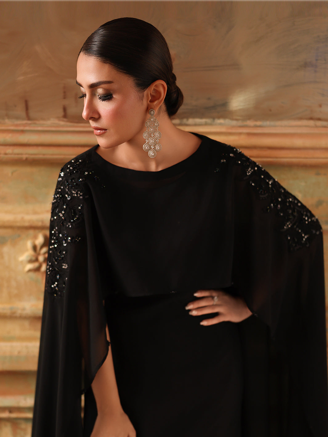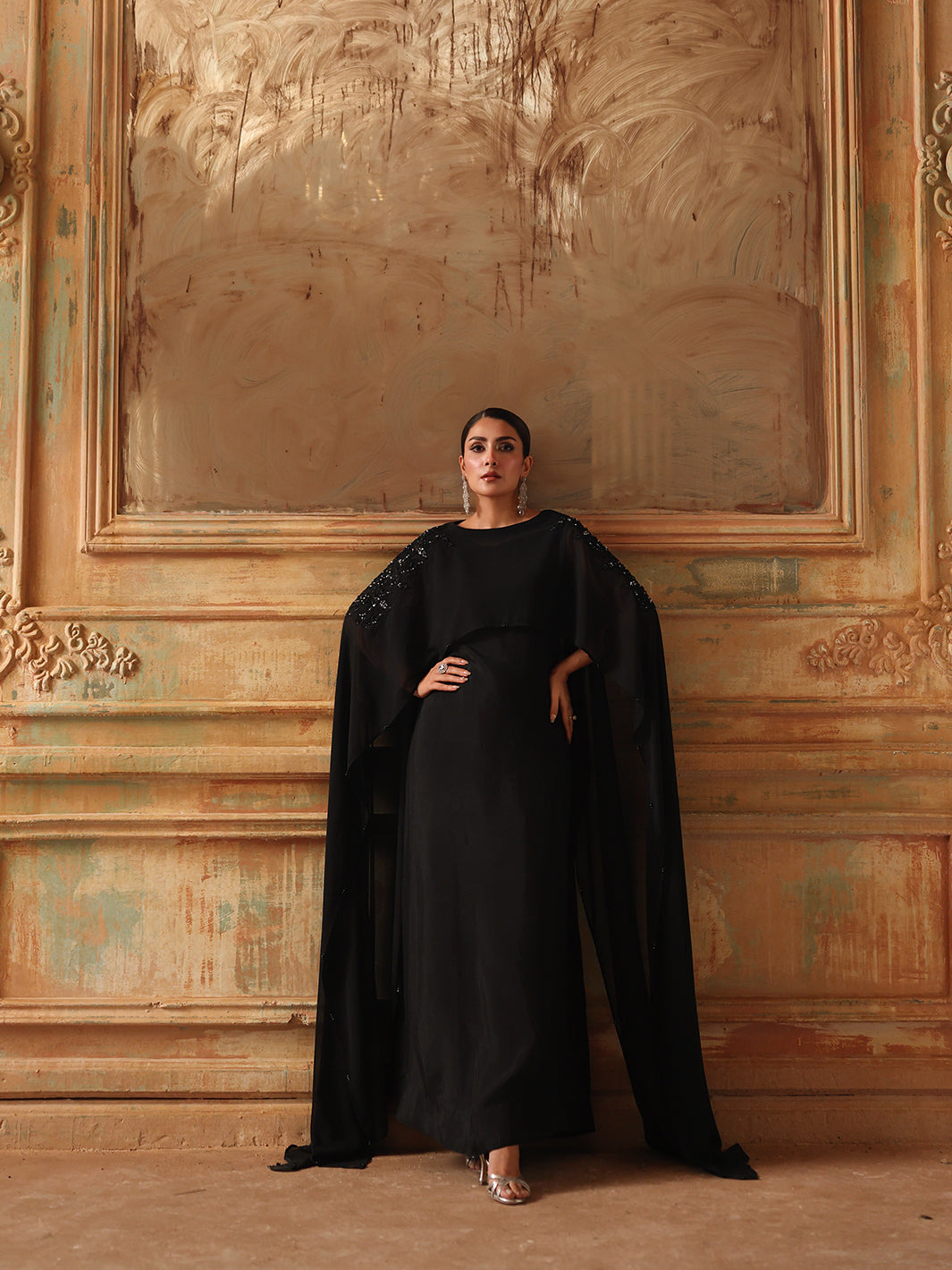 Chiffon shrug slapped together with hand-done adda work, diamantes, crystals, sequin embroidery, and naqshi work