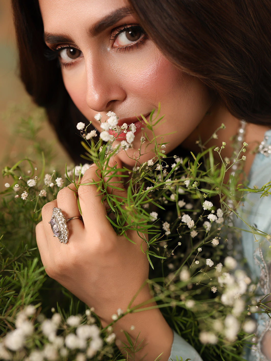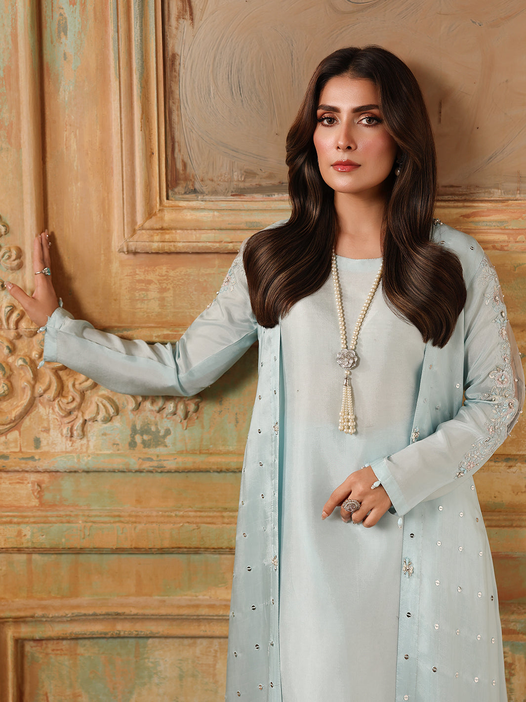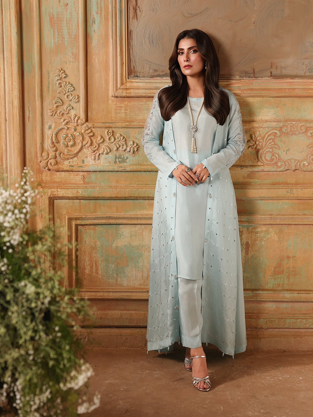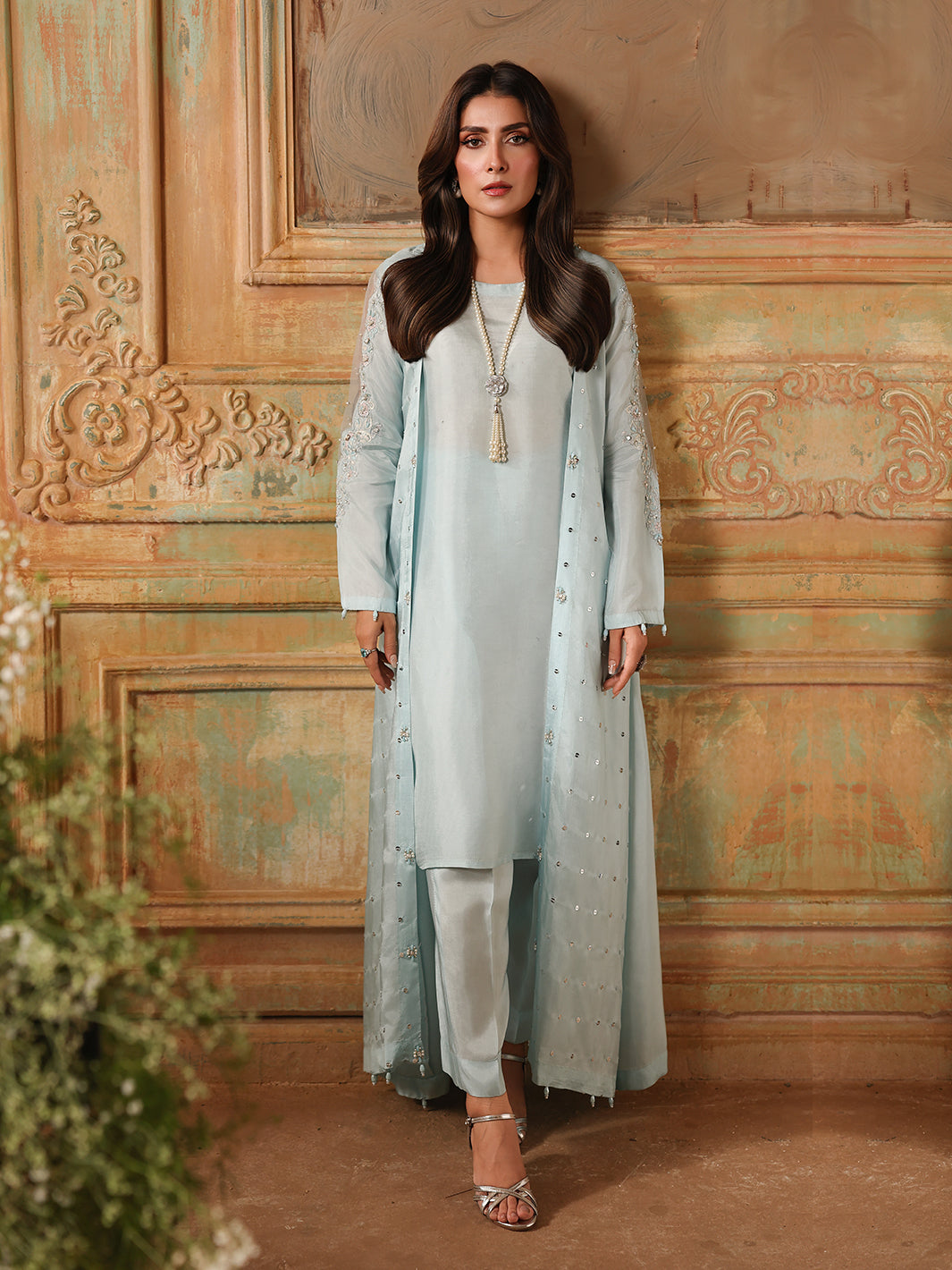 A luxurious silk gown, intricately adorned with hand-composed adda work, pearls, crystals, diamantes, and sequin embroidery